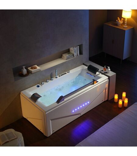 Baignoire balnéo Whirlpool rectangulaire 170x80 : G-ClevelandCette baignoire balnéo rectangulaire 170x80 cm existe en droite ou gauche. Lorsque vous regardez votre baignoire, sur le modèle gauche la robinetterie se situe à votre gauche. Il est donc nécessaire avant de faire votre choix de bien visualiser la baignoire chez vous, à sa place.La baignoire balnéo 170x80 Cleveland possède 46 jets et une cascade pour cervicales pour prendre soin de vous.Pour le dos, 6 jets eau + air et la cascade cervicales vous massent. 4 Jets plantaire eau + air vous font vivre une véritable séance de réflexologie pour vous soulager le corps entier. 12 jets eau + air latéraux font tourbillonner l'eau sur votre corps. Et enfin, 24 injecteurs d'air en fond de cuve complètent votre bien-être.Existe en modèle droite et gauche.------La livraison est assurée par transporteur (Assurance comprise).Toutes nos baignoires sont garanties 5 ans*.*Voir CGV – Type de produit : Baignoire Rectangulaire – Matière : ...