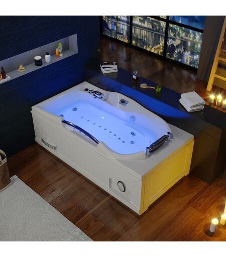 Baignoire balnéo rectangulaire : G-FidjiCe modèle de baignoire balnéo rectangulaire existant en modèle droite ou gauche, il est nécessaire de réfléchir avant l'achat à son emplacement dans votre salle de bain.En l'occurence, la G-Fidji se placera dans un angle avec la robinetterie à gauche lorsque vous regardez face à l'appui-tête.Son fond ergonomique vous permet un confort d'utilisation optimal et un maintien parfait.Ce modèle associe des jets d'eau, d'air et d'acupuncture. Votre dos se fera dorloter par 5 jets d'acupuncture et 3 turbobuses. 2 Turbobuses orientables latérales et 2 turbobuses orientables plantaires auront un effet drainant sur votre corps.Le fond de la cuve quant à lui est semé de 12 injecteurs d'air et 6 jets d'eau.Existe en modèle droite et gauche.------La livraison est assurée par transporteur (Assurance comprise).Toutes nos baignoires sont garanties 5 ans*.*Voir CGV – Type de produit : Baignoire Rectangulaire – Matière : Acrylique pure renforcée en fibre de verre ...