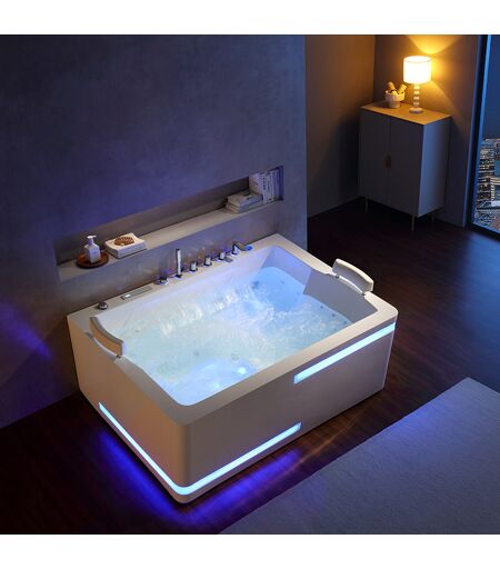 Baignoire balnéo rectangulaire Santana 64 jets Laissez entrer la lumière dans votre salle de bain avec cette magnifique baignoire balnéo rectangulaire et sa large cascade éclairée. Cette magnifique baignoire bénéficie de 64 jets massants pour une détente absolue. Les spots subaquatiques et les éclairages sur tablier diffusent leur lumière pour illuminer votre salle de bain toute entière et disperser ses bienfaits thérapeutiques ! Le + : la large cascade intérieure et ses multiples éclairages pour une expérience de bain sans égale. ...