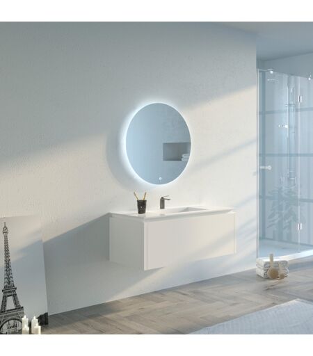 Ensemble meuble 100cm de salle de bain simple vasque STRANO 1000 B Ce petit meuble de salle de bain de 100cm avec simple vasque intégrée vous offre tout le confort nécessaire dans un minimum d'espace. Ce meuble blanc renforcera la lumière de votre salle de bain. Grâce à son grand tiroir de rangement, ce meuble de salle de bain 100cm vous offre un bel espace pour ranger vos affaires de toilette et autres accessoires de beauté. Sa simple vasque intégrée conçue en résine minérale (Solid surface) vous assure une longévité exceptionnelle du produit grâce à une matière haute qualité qui rend le nettoyage très facile. Ce meuble simple vasque blanc est fourni avec un miroir panoramique éclairé par LED fonctionnant à l'aide d'une touche tactile rétro-éclairé, intégrez plus de technologie dans votre salle de bain ! Meuble équipé du système à fermeture douce Push Open DTC. ------ Livré sans robinetterie (uniquement bonde), et sans flexible. Le + : Sa luminosité ...