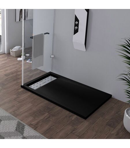 Receveur de douche prêt extra plat en gel coat : ALICANTE Noir 120x80 Ce receveur de douche en gel coat est parfaitement adapté pour les conditions extrêmes de la salle de bain. Ce revêtement habituellement utilisé dans le nautisme ou pour les piscines résiste parfaitement aux chocs, aux produits chimiques, aux différences de températures, aux UV, aux rayures et bien sûr à l'eau. Il s'agit d'une résine polyester mêlée à des pigments naturels et des additifs. Elle imite à la perfection les matériaux naturels, ici la texture du sable en noir, pour un rendu très esthétique tout en offrant un toucher agréable et chaleureux, anti-dérapant et anti-bactérien. Teintée dans la masse elle ne perd pas l'intensité de sa couleur et garantit une grande durabilité. Ce modèle est à poser ou à encastrer à effleurement, comme bon vous semble. Il possède une faible pente pour l'évacuation de l'eau. La grille de vidange rectangulaire de ce modèle est en acier inoxydable brossé très moderne. Dimensions de la grille pour un receveur de 80 cm de large : 68 x 12,5 cm. Siphon, bonde siphoïde perçage 90 mm et grille de vidange inclus. ...