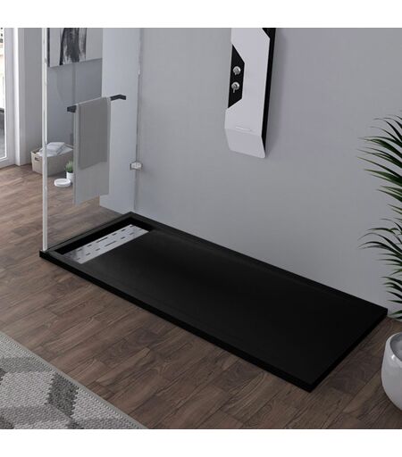 Receveur de douche prêt extra plat en gel coat : ALICANTE Noir 160x80 Ce receveur de douche en gel coat est parfaitement adapté pour les conditions extrêmes de la salle de bain. Ce revêtement habituellement utilisé dans le nautisme ou pour les piscines résiste parfaitement aux chocs, aux produits chimiques, aux différences de températures, aux UV, aux rayures et bien sûr à l'eau. Il s'agit d'une résine polyester mêlée à des pigments naturels et des additifs. Elle imite à la perfection les matériaux naturels, ici la texture du sable en blanc, pour un rendu très esthétique tout en offrant un toucher agréable et chaleureux, anti-dérapant et anti-bactérien. Teintée dans la masse elle ne perd pas l'intensité de sa couleur et garantit une grande durabilité. Ce modèle est à poser ou à encastrer à effleurement, comme bon vous semble. Il possède une faible pente pour l'évacuation de l'eau. La grille de vidange rectangulaire de ce modèle est en acier inoxydable brossé très moderne. Dimensions de la grille pour un receveur de 80 cm de large : 68 x 12,5 cm. Siphon, bonde siphoïde perçage 90 mm et grille de vidange inclus. ...