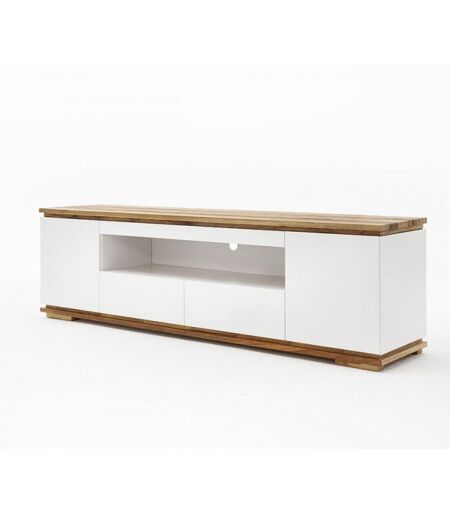 MCA FURNITURE Meuble TV CHARLY blanc mat 2 tiroirs 2 portes 1 niche socle plateau chêne massif