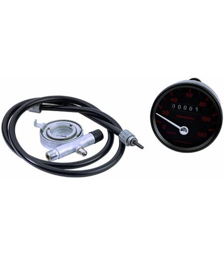 Ensemble compteur de vitesse 120Km/h neuf de marque Transval. Ce kit comprend: - Un compteur 120Km/h (rond, cuvelage Ø60mm) pouvant être équipé d'un éclairage (ampoule non fournie). - Un câble (72cm). - Un entraineur/démultiplicateur 20 x 1.6 (axe Ø11mm). Prévu pour cyclomoteur Peugeot 103 SPX/RCX équipée de jantes en 16 pouces. Livré conforme à la photo. ...