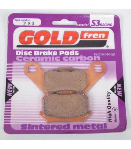 Plaquette de frein métal fritté GOLD Fren type 283 qualité S3 neuve. Dimensions: - Longueur: 103.5mm - Largeur: 42.4mm - Épaisseur: 9.1mm - Longueur 2: 62.5mm - Largeur 2: 34.1mm - Épaisseur 2: 11mm Vendues par paire. Livrées conforme à la photo. ...
