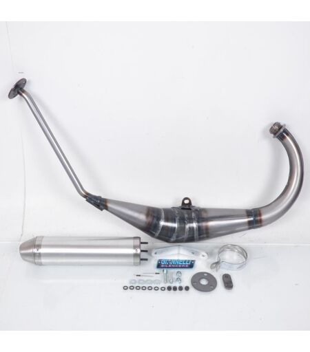 Pot d'échappement de détente (ligne complète) homologué CE neuf de marque Giannelli, pour moto 2 Temps, passage bas à droite. Vendu avec la visserie de fixation. Livré conforme à la photo. ...