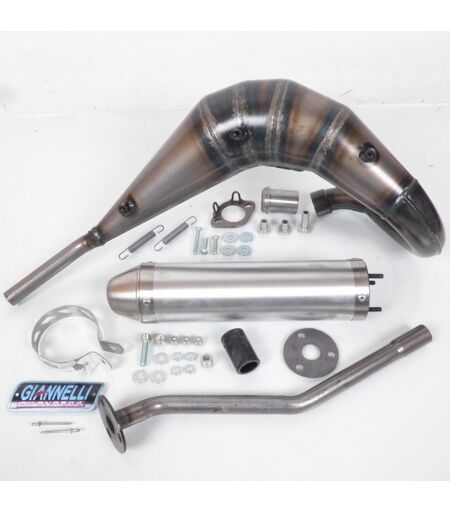 Ligne d'échappement homologué neuf de détente de la marque Giannelli pour moto 2 Temps. Dimension: - Diamètre intérieure coté cylindre 32mm. - Entraxe de fixation de la bride de serrage 48mm Produit vendu avec un silencieux aluminium. Livré conforme aux photos. ...