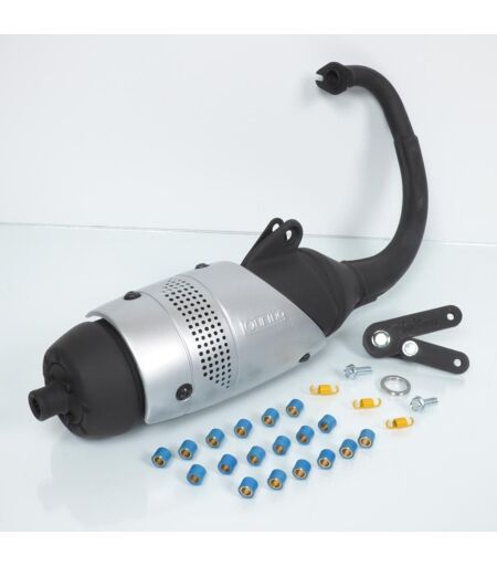 Pot d'échappement neuf type origine de marque Leovince, modèle Touring homologué CE, améliorant les performances d'origine. Le corps d'expansion du pot est fabriqué en acier 10/10 avec une peinture électrostatique qui résiste aux hautes températures et aux agents atmosphériques. L'intérieur du silencieux à cloisons permet d'éviter à l'huile du moteur de boucher le pot pour assurer une longue durée dans le temps. Vendu avec : - Un jeu de six galets 15mm x 12mm x 4,3 grammes. - Un jeu de six galets 15mm x 12mm x 4,7 grammes. - Un jeu de six galets 15mm x 12mm x 5,8 grammes. - Un jeu de trois ressorts d'embrayage dur (jaune). Livré conforme aux photos. ...