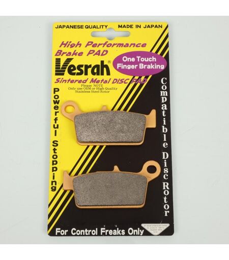 Plaquettes de frein métal fritté neuves de marque Vesrah. Dimensions : - Longueur : 74.9mm. - Largeur : 36.1mm. - Épaisseur : 11mm. Vendues par paire. Livrées conformes à la photo. ...