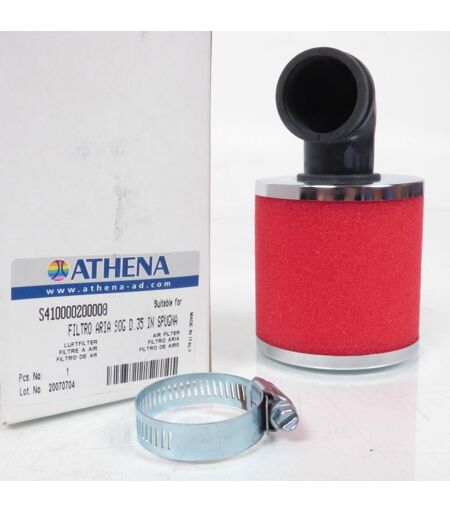Filtre à mousse coloris rouge/chromé neuf de marque ATHENA. Ce filtre à air cornet est coudé 90°. Il mesure 139mm de longueur totale et 80mm de diamètre extérieur. Le manchon caoutchouc qui s'emboîte sur le carburateur mesure 35mm de diamètre intérieur. Vendu à l'unité avec le collier de serrage. Livré conforme à la photo. ...