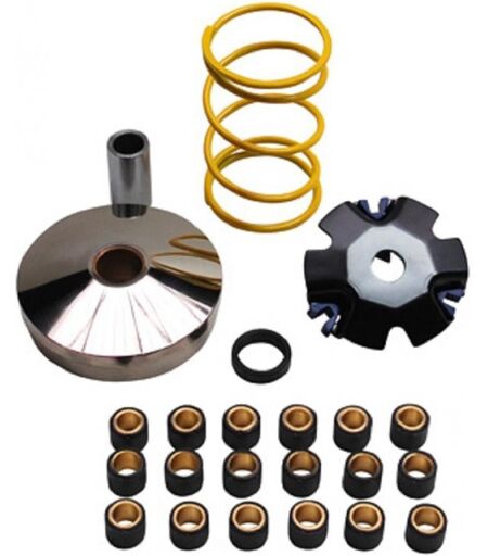 Variateur Racing neuf de marque Replay comprenant: la joue mobile, le plateau d'appui des galets, un ressort d'embrayage, le canon de variateur, les trois guide de variateur et trois jeu de six galets 16x13mm (5, 6 et 7 grammes). Prévu pour scooter équipé de moteur 4 temps type 139QMB. Livré conforme à la photo. ...