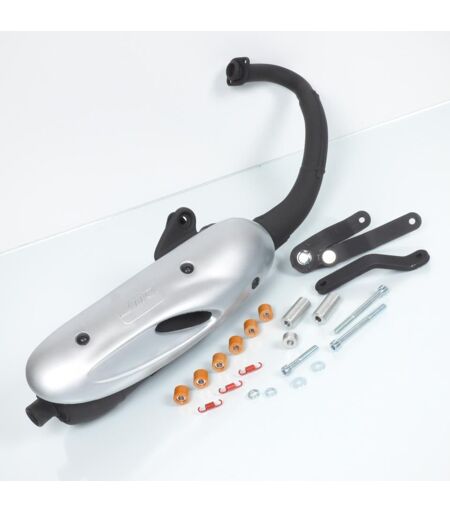 Pot d'échappement neuf type origine de marque Sito Plus homologué améliorant les performances d'origine. Les silencieux sont fabriqués en acier spécial en utilisant la technologie de construction "Double Chambre", avec un silencieux interne complètement indépendant de la structure extérieure. Vendu avec: - Un jeu de six galets 19mm x 15,5mm x 4,8 grammes. - Un jeu de trois ressorts d'embrayage medium (rouge). Prévu pour scooter équipé de moteur Piaggio à carburateur. Livré conforme aux photos. ...