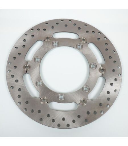 Disque de frein avant flottant acier neuf. Dimensions: - Diamètre extérieur: 300mm - Diamètre intérieur: 130mm - Épaisseur: 5mm - Nombre de trous: 7 - Diamètre des trous de fixation: 10.5mm - Entre axe des trous de fixation: 150mm - Déport: 0 Vendu à l'unité. Livré conforme à la photo. ...