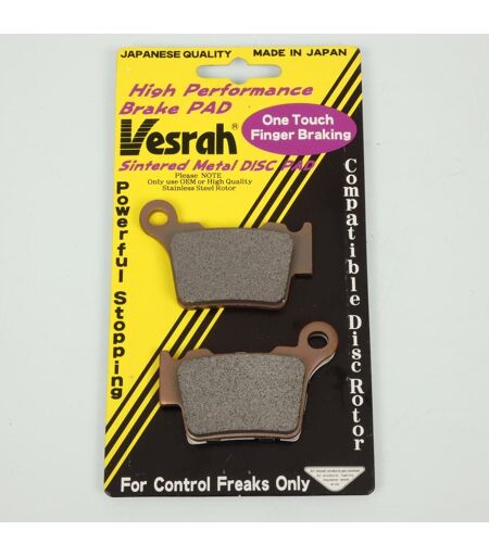 Plaquettes de frein métal fritté neuves de marque Vesrah. Dimensions : - Longueur : 64mm. - Largeur : 41.8mm. - Épaisseur : 9mm. Vendues par paire. Livrées conformes à la photo. ...
