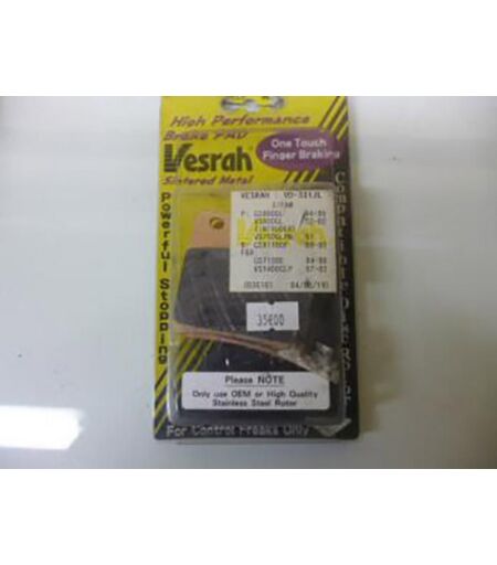 Plaquettes de frein métal fritté neuves de marque Vesrah. Dimensions : - Longueur : 58mm. - Largeur : 56.6mm. - Épaisseur : 8.5mm. Vendues par paire. Livrées conformes à la photo. ...