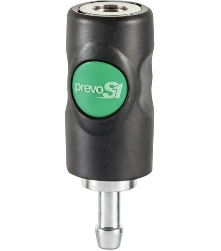 Einhand-Sicherheitskupplung NW 7,4 - Druckknopf-Ausführung Anschluss LW 9 für Schlauch Ø 9 mm innen, ESI 071809 (passend zu Standard-Kupplungen und Einstecknippeln NW 7,4) Einfach Mit einem Handgriff druckentlasten und Druckluftwerkzeug oder System anschließen Sofortiger und kraftsparender Anschluss Kompatibel mit allen europäischen Standardverbindungen (7,4 mm) einsetzbar Sicher Anschluss lässt sich völlig sicher lösen Keine Gefahr eines "Peitschenhiebs" oder einer unbeabsichtigten Abtrennung Automatische Druckentlastung und Abtrennung Geprüfte Sicherheit, entspricht ISO 4414 und DIN EN 983 Leistungsstarke Sicherheitskupplung ESI 071809 Ergonimische und kompakte Form für eine intuitive, problemlose Handhabung Kompakte Maße Optimierter Medienfluss Ohne Druckverlust Völlige Dichtheit der Kupplung Dichtheit der Gewinde durch Flachdichtung Kupplung für Schläuche Montage mit Schraubklemmen oder Ohrklemmen Robust Kupplung aus verstärktem Verbundmaterial mit verbesserten mechanischen ...