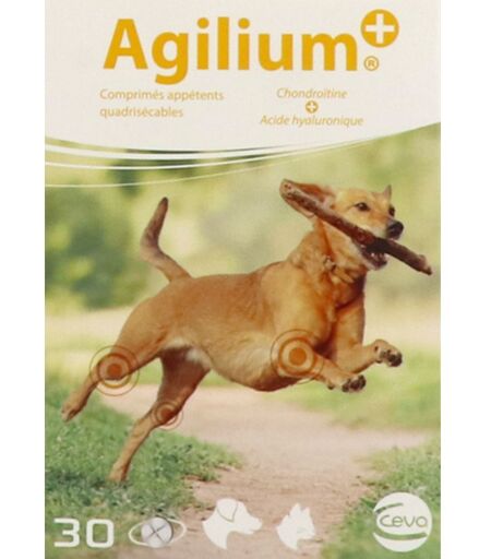 Agilium™ permet un apport en acide hyaluronique et sulfate de chondroïtine, molécules naturellement présentes dans le cartilage articulaire et/ou la synovie.Agilium™ peut être utilisé :Chez les chiens et chats prédisposés à la dégénérescence du cartilage (âgés de plus de 8 ans, de grande taille, souffrant d’une surcharge pondérale ou de race lourde à croissance rapide).En période de récupération pour soutenir le métabolisme articulaire et osseux.En cas d’immobilisation prolongée d’un membre.Recommandations nutritionnellesNombre de comprimés par jour selon le poids de l'animalPoids de l’animalPhase d’attaque (3 semaines)Phase d’entretien2-10 kg1/21/410-20 kg11/220-30 kg1 1/23/430-40 kg21> 40 kg42CompositionSulfate de chondroïtine (21,6 %)Levure de bièreAmidon prégélatiniséHyaluronate de sodium (0,3 %)Stéarate de magnésiumConstituants analytiquesProtéines brutes : 23,0 %Cellulose brute : 22,0 %Matières grasses brutes : 4,0 %Cendres brutes : 11,0 %Additifs par kiloOligo-éléments :Manganèse (3b503)Vitamines :Vitamine C (3a300)Vitamine E (3a700) ...