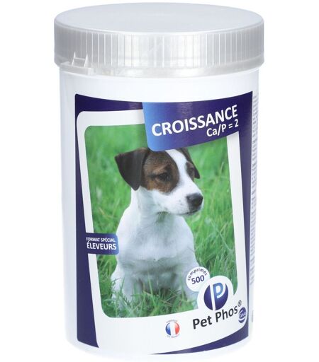 Pet Phos Croissance Ca/P = 2 est un aliment complémentaire destiné aux chiots en croissance et aux femelles en gestation ou en lactation. Sa formule équilibrée en calcium et phosphore soutient la croissance osseuse et le développement optimal des chiots, tout en comblant les besoins nutritionnels des femelles.IndicationPour chiots en croissance et femelles en gestation ou lactation.Recommandations nutritionnellesGESTATION½ comprimé matin et soir pour 10 kg sauf la dernière semaine de gestation.CROISSANCEPetites et moyennes races (adultes ≤ 25 kg): 1 comprimé matin et soir pour 5 kgGrandes races* (adultes > 25 kg): 3 comprimés matin et soir pour 10 kg LACTATIONPetites et moyennes races (adultes ≤ 25 kg): 1 comprimé matin et soir pour 5 kgGrandes races* (adultes > 25 kg): 2 comprimés matin et soir pour 10 kg* Préférer plutôt Pet Phos® CROISSANCE Ca/P = 2 Grand ChienCompositionPhosphate bicalcique, Levure de bière, Carbonate de calcium, Protéines animales transformées (foie de porc, foie de volaille), Mono-, di- et triglycérides d’acides gras (stéarique/palmitique), Oxyde de magnésium.Constituants analytiquesCalcium ..... 15,5 %Phosphore ..... 7,6 %Humidité ..... 5 %Protéines brutes ..... 21 %Matières grasses brutes ..... 3 %Cendres brutes ..... 46 %Magnésium ..... 0,14 %Additifs par kiloVitamines :3a672a Vitamine A ............…232 000 UI/kg3a671 Vitamine D3................… 22 325 UI/kgOligo-éléments :3b103 Fer (sulfate de fer monohydraté)..........................…195 mg/kg3b202 Iode (iodate de calcium anhydre)........................…25 mg/kg3b405 Cuivre (sulfate de cuivre pentahydraté).............50 mg/kg3b502 Manganèse (oxyde de manganèse II) ...............…20 mg/kg3b605 Zinc (sulfate de zinc monohydraté).......................…20 mg/kgAntioxygènes :E 321 Butylhydroxytoluène (BHT) ..…16 mg/kgSubstances aromatiques :2b17003 L-Arginine ...…460 mg/kg ...