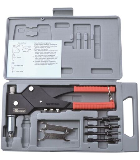 TABLEAU TECHNIQUE Embout : 2,4 à 4,8 mm Utilisation : Intensive Description technique : "Coffret pince à rivets & pose inserts Tête double position permettant de travailler avec une ou deux mains. Parfaite aussi pour les endroits difficilement accessibles Poignées gainées Capacité : Pour les rivets de 2.4 à 4.8 mm alu + acier + inox Pour les inserts de 3 à 6 mm alu + acier ." Informations complémentaires : "Reconnue pour sa robustesse, cette pince ""à double position"" fonctionne sur les rivets de 2.4 à 4.8 mm alu, acier et même inox et fait également fonction de pose insert avec une capacité de M3 à M6 alu & acier. Livrée complète en coffret avec un jeu de 4 embouts plus un jeu de 4 tirants et ses clés de service. Sans doute la meilleure pince actuellement sur le marché." ...