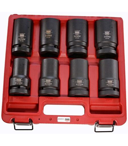 TABLEAU TECHNIQUE Taille du carré : 1'' Type de douille : Longue En coffret : Oui Catégorie : Douille à chocs Informations complémentaires : Ce coffret contient les douilles suivantes : - 24 mm - 27 mm - 30 mm - 32 mm - 33 mm - 36 mm - 41 mm - 46 mm ...