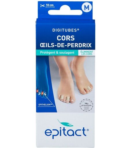 Un orteil douloureux ? Un cor ou un œil de perdrix (cor situé entre 2 orteils) ? Adoptez le Digitube® EPITACT® ! Grâce au gel silicone Epithelium 26® qui le constitue, il évite la corne et les douleurs liées à des pressions et frottements excessifs. Le Digitube® est tellement fin qu’il peut même être porté dans des escarpins ! Son gros avantage en plus de sa finesse : il est lavable et réutilisable ! C’est donc une solution à la fois discrète, efficace et économique. Taille 4eme, 5eme orteil 2eme, 3eme orteil Gros orteil Femme S S M Homme S M L Bénéfices 1 mm d’Epithelium 26® sur la demi-circonférence du Digitube® suffit à soulager les pressions et prévenir la formation de cors dorsaux et oeils de perdrix sur les doigts de pied. L’élasticité et la douceur du tissu choisi contribuent au confort du dispositif. Leur faible encombrement permet l’installation sur des orteils voisins sans aucune gêne. Les Digitubes® sont lavables à l’eau et au savon. Avec seulement 1.5 cm de Digitube®, vous protégez votre cor pendant 10 jours en moyenne. Vendus par lot de 3 Digitubes® de 10 cm à découper. Conseils d'utilisation Découper un Digitube® avec de bons ciseaux à la longueur désirée. Enlever la pellicule de protection recouvrant le gel. Retourner le Digitube® sur lui-même de façon à obtenir un manchon et le mettre en place sur l’orteil en positionnant le gel d’EpitheliumTM en contact avec la zone à protéger. Composition Gel de silicone. Tissu polyamide élasthanne. Conditionnement 1 doigtier ...