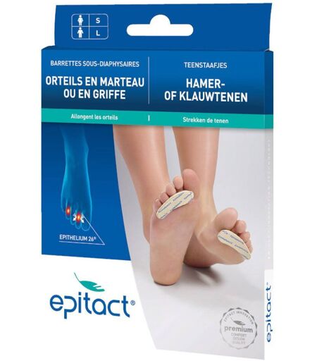 Les orteils en marteau ou en griffe sont souvent associés au pied creux. Ce sont des déformations correspondant à un relèvement des orteils ou à leur recroquevillement sur eux-mêmes. Ceux-ci sont par conséquent souvent en conflit avec la chaussure et présentent des rougeurs, des irritations voire des cors. Ces orteils relevés n’accomplissent évidemment plus leurs fonctions d'appuis. Ceux-ci sont alors reportés sur une autre zone provoquant une surcharge et des hyperpressions caractérisées par des durillons sous l'avant-pied.Afin de remédier à cela et de limiter les douleurs engendrées, EPITACT® a développé des protections en silicone adaptées recouvertes d’un textile à la fois doux et fin pour votre confort.Le protège-pointes vise à protéger le dessus des orteils en griffe ou en marteau des cors. La lunule de silicone absorbe les pressions et les frottements pour apaiser les douleurs. Elle participe ainsi à faire disparaître naturellement les cors dorsaux.Les barrettes sous-diaphysaires sont étudiées pour allonger confortablement les orteils en marteau ou en griffe sur une pièce de silicone doublée de textile doux et résistant. Elles modifient les appuis pour redonner aux orteils leur fonction initiale et limitent l’apparition de durillons sous l’avant-pied.IndicationsDouleurs aux orteils : protections en silicone pour orteils en marteau / en griffeConseils d’utilisationPrendre la barrette en la tenant face bombée sur le dessus.Passer l'élastique autour du 3ème orteil de façon à ce que le 2ème orteil se trouve appuyé sur la partie la plus large de la barrette.Positionner la barrette dans l'espace situé sous les orteils.Enfiler la chaussette, le bas ou le collant par-dessus pour un meilleur maintien.Entretien Lavables en machine à 40°C dans le filet de lavage ou à la main (sans frotter).Laisser sécher naturellement.Précautions d' emploi Ne pas utiliser sur une plaie non protégée.Cas des personnes souffrant d’artérite, de diabète, de polynévrite, de neuropathie des membres inférieurs ou d’ulcères variqueux : ne jamais utiliser le produit sur une plaie, surveiller le pied pendant l’utilisation et en cas de doute demander conseil à votre médecin ou podologue.Composition90 % silicone. 10 % tissu polyamide/ élasthanne.Conditionnement1 paire ...
