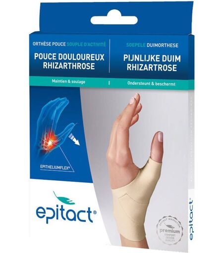 Développée pour soulager les douleurs articulaires liées à la rhizarthrose ou arthrose du pouce, cette orthèse souple permet de faire les gestes de la vie quotidienne tout en limitant les micromouvements traumatisants. A porter dans la journée, sans modération.BénéficesL’orthèse souple ouvre la commissure ce qui permet de maintenir le pouce en position de repos. L’alignement des os du pouce va limiter les forces s’exerçant sur l’articulation trapézo-métacarpienne et aider à soulager la douleur.L’orthèse pouce absorbe les micromouvements traumatisants. Pendant la journée, le pouce semble au repos alors qu’il bouge sans cesse avec le déplacement des mains dans l’espace. Ces micro-mobilisations répétées sont très préjudiciables et sont l’un des facteurs déclencheurs des poussées inflammatoires douloureuses. Sans immobiliser, l’orthèse souple va maintenir le pouce et le 1er métacarpien. Ce maintien proprioceptif va aider à absorber les micro-mobilisations traumatisantes et limiter ainsi les poussées inflammatoires douloureuses liées à l’arthrose.L’orthèse pouce maintient la chaleur locale grâce aux propriétés de son tissu et de son tissu en silicone. Elle procure ainsi un effet antalgique.L’orthèse EPITACT® est complémentaire aux orthèses rigides, mieux adaptées à un port nocturne.Lavable en machine à 40°C dans le filet de lavage prévu à cet effet.Durée de vie: plusieurs mois.Vendue à l'unité. Disponible en 3 tailles, pour main droite ou main gauche.IndicationsLe produit a fait l’objet de tous les tests imposés selon la norme ISO 10993-1. Si malgré cela, une réaction allergique était observée, arrêter immédiatement l’utilisation du produit et informer la société MILLET Innovation.Ne pas utiliser sur une plaie non protégée.En cas d’œdème sévère : surveiller la main pendant l’utilisation. Oter le dispositif si le serrage est trop important et entrave la circulation. En cas de doute, demander conseil à votre médecin ou à votre pharmacien.Ne pas utiliser à côté d’une flamme ou d’un corps incandescent.Si une réaction allergique est observée, arrêter immédiatement l’utilisation du dispositif informer la société Millet Innovation.Conseils d'utilisationEnfiler l’orthèse sur la main en faisant glisser le pouce dans son emplacement. La couture doit se positionner à l’intérieur de la main. Pour un confort optimal, régler la position de l’orthèse en déplaçant légèrement la couture plus ou moins au centre de l’intérieur de la main.CompositionGel de silicone. Tissu polyamide élasthanne.Conditionnement1 orthèse de jour ...