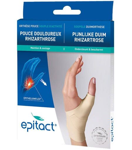 Développée pour soulager les douleurs articulaires liées à la rhizarthrose (ou arthrose du pouce), cette orthèse souple permet de faire les gestes de la vie quotidienne tout en limitant les micromouvements traumatisants. A porter dans la journée, sans modération…BénéficesLe port pendant la journée de l’Orthèse proprioceptive EPITACT® aide à soulager les douleurs articulaires liées à de l’arthrose à la base du pouce (rhizarthrose). Elle limite les micro-mouvements traumatisants (déplacement des mains dans l’espace en marchant, parlant…), maintient le pouce en position de repos et préserve la chaleur locale au niveau de l’articulation. Souple, fine et discrète, cette orthèse vous permet de conserver l’entière fonctionnalité de votre main : vous pouvez conduire, écrire, utiliser votre téléphone… et porter votre montre ou vos bijoux !IndicationsRhizarthrose (arthrose du pouce)Conseils d'utilisationCe produit est une orthèse de jour. Enfiler l’orthèse sur la main en faisant glisser le pouce dans son emplacement. La couture doit se positionner à l’intérieur de la main. Pour un confort optimal, régler la position de l’orthèse en déplaçant légèrement la couture plus ou moins au centre de l’intérieur de la main.CompositionGel de siliconeTissu polyamide élasthanneConditionnement1 orthèse pour main droite, taille S (circonférence poignet entre 13 et 15 cm) ...