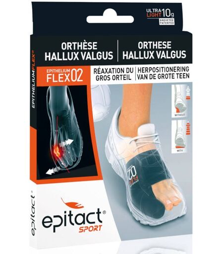 Lʼorthèse souple de lʼhallux valgus EPITHELIUMFLEX®02 permet de réaxer le gros orteil, de limiter la pronation et ainsi dʼoptimiser la propulsion. Lors de la pratique sportive, la qualité des appuis est primordiale pour prévenir les blessures et améliorer les performances. L’orthèse permet aussi de soulager la douleur liée à l’hallux valgus, que celui-ci soit débutant ou déjà très marqué.Attelle, redresseur, correcteur, orthèse corrective pour l’hallux valgus… voici la panoplie des solutions disponibles pour corriger et soulager un hallux valgus douloureux. Pourtant rares sont celles qui peuvent se porter sur le pied en journée. L’orthèse corrective hallux valgus EPITHELIUMFLEX®02 s’insère dans vos chaussures de sport : elle limite la douleur et l’évolution de votre hallux valgus débutant tout en favorisant votre performance.FONCTIONNALITÉS : L’orthèse corrective hallux valgus EPITHELIUM FLEX 02 présente trois actions complémentaires:ERGONOMIE : Concentré de technologie dans moins de 10 g, l’orthese hallux valgus EPITHELIUM FLEX 02 a été spécialement conçue pour agir en dynamique lors de votre pratique sportive (Randonnée, course à pied…). Contrairement à un redresseur, à un correcteur ou à une attelle hallux valgus classique, l'orthèse souple et ultra fine s’adapte dans toutes les chaussures : elle peut donc être portée en journée.UNE ACTION CORRECTIVE : Le tendon en silicone EPITHELIUM FLEX® associé à la pastille de contre-appui permet de réaxer le gros orteil, de limiter la pronation et ainsi d’optimiser la propulsion. Lors de la pratique sportive, la qualité des appuis est primordiale pour prévenir les blessures et améliorer les performances.UNE ACTION PROTECTRICE : Le tendon externe EPITHELIUMFLEX® permet d’absorber les pressions et les frottements sur l’exostose ("oignon") et d’éviter les risques d’échauffements. L’orthèse soulage ainsi les hallux valgus douloureux.UNE ACTION DE MAINTIEN : Le bracelet métatarsien de contention permet de limiter l’écrasement et l’élargissement de l’avant pied.Bénéfices UltrafinesUltralégèresLavables en machine à 30°C Existe en version médicale jour/nuitSe portent dans toutes les chaussures de sportIndicationsDéveloppée pour relaxer l'orteil durant la pratique sportiveContre-indicationsNe pas utiliser si le gros orteil est non mobile.Ne pas utiliser durant la nuitNe pas utiliser sur une plaie non protégée.Conseils d'utilisationPasser lʼavant-pied dans le bracelet.Encapuchonner ensuite le gros orteil.Placer la pastille en Epithelium™ (a) en arrière de lʼoignon (b). Lors de la première utilisation, ne pas essayer de réaxer complètement le gros orteil.Lors des 10 premières utilisations, réaxer progressivement le gros orteil en tirant le dispositif vers lʼarrière. (Voir schéma 2).Le dispositif peut être porté quotidiennement pour obtenir une efficacité optimale.EntretienLaver en machine à 30°C ou à la main (sans frotter).Laisser sécher naturellement. Ne pas repasser.Composition52 % silicone, 48 % tissu... ...