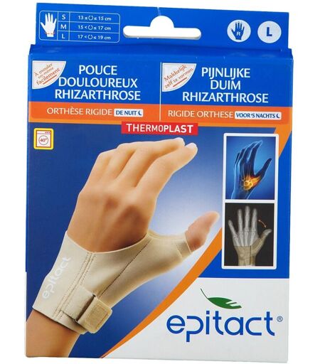 L’Orthèse rigide devient souple une fois immergée dans l’eau chaude. Dès que vous l’avez enfilée, elle prend la forme de votre main en positionnant naturellement votre pouce au repos. Elle durcit et redevient rigide en quelques minutes : vous disposez ainsi d’une orthèse sur mesure. Le port quotidien de l'orthèse EPITACT® pour la nuit aide à soulager les douleurs articulaires dans la base du pouce. L'orthèse est si léger que vous ne souffrez pas pendant le sommeil. Facile de former avant de l'utiliser. COMBINAISON AVEC L'ORTHESE FLEXIBLE POUR DANS LA JOURNEE => EFFICIENCE MAXIMALE: ces deux orthèses se complètent parfaitement. Ils soulagent la douleur et empêchent la poursuite du développement de l'arthrose du pouce. Sans immobiliser le pouce, l'orthèse flexible intercepte des micro-chocs nuisibles qui causent la douleur. Pendant la nuit, l'orthèse RIGIDE garde le pouce en position afin que vous puissiez mieux dormir. Indication Le port quotidien de l’Orthèse de nuit EPITACT®, aide à soulager les douleurs articulaires à la base du pouce et contribue à limiter l’évolution de la rhizarthrose.UsageEn complément de l’Orthèse rigide de nuit, nous vous conseillons de porter l’Orthèse souple de jour EPITACT® qui va absorber les micro-mobilisations traumatisantes et ainsi limiter la douleur.• Enfiler l’orthèse sur la main en faisant glisser le pouce dans son emplacement.• Insérer la sangle auto-agrippante dans la boucle à la base du pouce, serrer légèrement l’orthèse autour du poignet.Ingredients47 % tissu polyamide/élasthanne, 53 % plastique thermoformable.Warning Le produit a fait l’objet de tous les tests imposés de la norme ISO 10993-1.Si malgré cela, un incident se produisait, arrêter immédiatement l’utilisation du produit et informer la société MILLET Innovation. Ne pas utiliser sur une plaie non protégée. En cas d’oedème sévère : surveiller la main pendant l’utilisation. Ôter le dispositif si le serrage est trop important et entrave la circulation. En cas de doute, demander conseil à votre médecin ou votre pharmacien. Ne pas utiliser à côté d’une flamme ou d’un corps incandescent.La responsabilité de la société MILLET Innovation ne peut être engagée en cas d’utilisation non conforme aux recommandations du fabricant. Side effects Laver en machine à 40°C. Ne pas utiliser de détachant (acétone, dissolvant etc …). Laisser sécher naturellement. Ne pas repasser. Ne pas exposer à la chaleur (>50°C). ...
