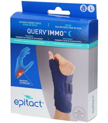 En cas de tendinite de De Quervain, d’entorses ou troubles musculosquelettiques du pouce et du poignet, QUERV’IMMO™ d'EPITACT® est la solution idéale. Le port de cette orthèse est préconisé en période de repos ou la nuit pour immobiliser le pouce. Ainsi, elle prévient les micromouvements traumatiques du pouce et du poignet pour soulager et limiter l’évolution des douleurs. ...