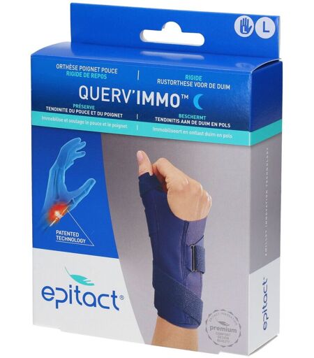 En cas de tendinite de De Quervain, d’entorses ou troubles musculosquelettiques du pouce et du poignet, QUERV’IMMO™ d'EPITACT® est la solution idéale. Le port de cette orthèse est préconisé en période de repos ou la nuit pour immobiliser le pouce. Ainsi, elle prévient les micromouvements traumatiques du pouce et du poignet pour soulager et limiter l’évolution des douleurs. ...