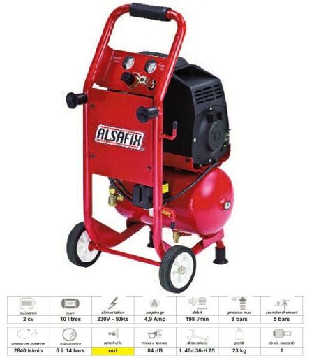 Alsafix - Compresseur 8 bars 10l sans huile - ALAIR 10/200 OILESS > Silencieux > Poignée de transport et Roues de chantier > Soupape de sécurité et Rallonge électrique de 4 mètres incluse > Disjoncteur thermique et Vis de purge installée pour la vidange > Raccord rapide G 1/4 > 1 sortie mâle 1/4 > Enclenchement automatique si chute de pression de 2,5 bars > Manomètre pour pression réservoir > Détendeur et manomètre pour la pression de service > Possibilité de le coucher > Très peu de maintenance grâce au moteur sans huile > Panneau de contrôle en façade Garantie 1 an ...