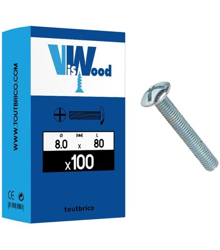 Caractéristiques : * 100 vis poêlier * Diamètre : 8mm * Longueur : 80mm * Empreinte de la tête : Phillips / cruciforme * Type de filetage : complet * Matériau : acier zingué * Norme : NFE 25219 ...
