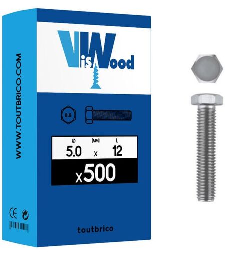 Caractéristiques : * Contenance : 500 vis à métaux * Diamètre : 5mm * Longueur : 12mm * Type de tête : tête hexagonale n°8 * Type de filetage : total * Résistance : classe 8.8 * Matériau : acier zingué * Norme : ISO 4017 / DIN 933 ...