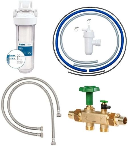 Contenu du kit de raccordement pour adoucisseur d'eau Perla Silk et New Access de BWT : 1 préfiltre DGD 5 et 20 micron 1 vanne bypass en laiton (2 entrées, 2 sorties et robinet prise d'échantillon) 2 flexibles 3/4' Siphon disconnecteur de mise à l'égout ...