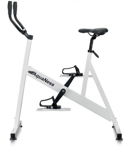 Vous aimez faire de l'aquabiking ? Ne le faites pas avec n'importe quel vélo : choisissez l'aquabike Aquaness V1, le vélo aquatique qui allie robustesse et légèreté. Découvrez le Vélo aquatique Aquaness V1 Aquabiking Idéal pour débuter l'aquabiking à domicile ! Ultra léger et robuste, le Vélo aquatique Aquaness V1 est idéal pour débuter la pratique de l'aquabike à domicile. Grâce à sa plateforme de pédale réglable, vous pourrez vous exercer avec plus ou moins d'effort lors du pédalage avec une meilleure résistance à l'eau. Sa résistance de freinage est caractérisée par la présence de 4 pales sous les pédales à écartement variables à régler avant la séance. Il est doté d'un guidon classique orientable et d'une selle réglable en hauteur. Son poids est de 10,1 kg. Les réglages et variations sont possibles pendant la séance. [fsm display="image" ids="1491" link="0"] Coloris disponibles Blanc, Gris Alu, Gris ardoise, Verre d'eau, Bleu ciel, Bleu clair, Jaune, Rose, Rouge [fsm display="image" ids="1492" link="0"] Caractéristiques techniques du Vélo aquatique Aquaness V1 Aquabiking Résistance au pédalage : Pales sous les pédales, écartement variable à régler avant ou après la séance Pédales : Anatomiques avec voute plantaire pour pédalage pieds nus (en néoprène avec sangle à pince) Guidon : Modèle classique "Aqua", orientable et réversible Protection au sol : Tampons (patins) diam. 60mm, pour tous les types de revêtements Hauteur d'eau recommandée : 1m10 minimum Matériau : Aluminium série 6000 de qualités marines (cadre, guidon, pédalier) Peinture : Epoxy bi-composant, haute résistance au sel comme au chlore (thermo-laquage) Anode sacrificielle : anti-corrosion Poids : 10 kg Dimensions du Vélo aquatique Aquaness V1 Aquabiking Largeur barre avant ou arrière (pied) : 66 cm Distance entre le pied avant et le pied arrière : 98 cm Hauteur variable sol-selle : de 82 à 107 cm (+25 cm) Hauteur sol-haut du guidon : 135 cm Distance sol-axe du pédalier : 40 cm [fsm display="image" ids="1490" link="0"] ...