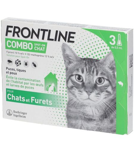 FRONTLINE Combo permet de lutter contre les parasites des chiens, des chats et des furets. Il est efficace contre :Les pucesFRONTLINE Combo tue les puces adultes dans les 24 heures suivant leur arrivée sur votre animal.Les œufs et larves de puces grâce à sa formule enrichie à l’IGRLes lieux de vie de votre animal sont des réservoirs de puces. En effet 95 % des puces se trouvent dans l’habitat sous forme d’œufs, larves et cocons (nichés dans les tapis, moquettes, coussins…). En plus d’éliminer les puces adultes de votre animal, FRONTLINE Combo évite la contamination de l’habitat par les œufs et les larves de puces grâce à son IGR. Il favorise ainsi l’assainissement de l’habitat. Cette double sécurité permet de lutter contre les ré infestations permanentes de votre animal.Qu’est ce qu’un IGR ?Un IGR (Insect Growth Regulator) est un régulateur de croissance des insectes qui réduit la ponte des puces, limite l’éclosion des larves et empêche la formation des cocons. Les tiquesFRONTLINE Combo élimine plus de 90 % des tiques dans les 48 heures suivant leur arrivée sur l'animal, afin de limiter le risque de transmission de maladies. Ce risque est maximal 48 heures après fixation de la tique sur l’animal.BénéficesPour les chats et furets.Conseils d'utilisationSortir la pipette de son emballage et casser l'embout au niveau de la partie prédécoupée.Ecartez les poils à la base du cou entre les omoplates jusqu’à ce que la peau de votre animal soit visible.L’application sur le chat doit se faire bien à la base de la tête afin d’éviter que l’animal puisse le lécher lui-même.Placer l’embout de la pipette sur la peau visible et presser la pipette plusieurs fois afin de vider totalement son contenu en un point. Appliquer sur une peau sèche.Attendre 2 jours après l’application avant de baigner votre animal. Conditionnement3 PipettesIl est indispensable de demander l’avis de votre vétérinaire ou de votre pharmacien. Si les symptômes persistent, consultez votre vétérinaire. ...