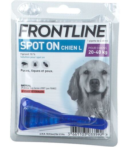 FRONTLINE Spot-On permet de lutter contre les parasites des chiens et des chats. Il est efficace contre :Les pucesFRONTLINE Spot-On tue les puces adultes dans les 24 heures suivant leur arrivée sur votre animal.Les tiquesFRONTLINE Spot-On élimine plus de 90 % des tiques dans les 48 heures suivant leur arrivée sur l'animal, afin de limiter le risque de transmission de maladiesCe risque est maximal 48 heures après fixation de la tique sur l’animal.Les poux des chiens et des chatsFRONTLINE Spot-On tue les poux présents sur l’animal en 48 heures maximum.BénéficesPour les chiens de 20 - 40 kg.Conseils d'utilisationSortir la pipette de son emballage et casser l'embout au niveau de la partie prédécoupée.Ecartez les poils à la base du cou entre les omoplates jusqu’à ce que la peau de votre animal soit visible.L’application sur le chat doit se faire bien à la base de la tête afin d’éviter que l’animal puisse le lécher lui-même.L’application sur le chat doit se faire bien à la base de la tête afin d’éviter que l’animal puisse le lécher lui-même.Appliquer sur une peau sèche.Attendre 2 jours après l’application avant de baigner votre animal. Conditionnement1 pipetteIl est indispensable de demander l’avis de votre vétérinaire ou de votre pharmacien. Si les symptômes persistent, consultez votre vétérinaire. ...