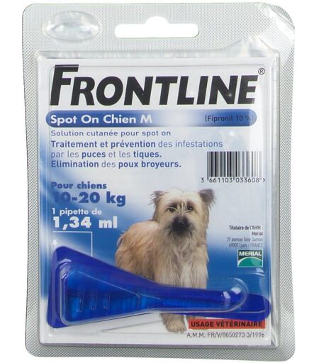 FRONTLINE Spot-On permet de lutter contre les parasites des chiens et des chats. Il est efficace contre :Les pucesFRONTLINE Spot-On tue les puces adultes dans les 24 heures suivant leur arrivée sur votre animal.Les tiquesFRONTLINE Spot-On élimine plus de 90 % des tiques dans les 48 heures suivant leur arrivée sur l'animal, afin de limiter le risque de transmission de maladiesCe risque est maximal 48 heures après fixation de la tique sur l’animal.Les poux des chiens et des chatsFRONTLINE Spot-On tue les poux présents sur l’animal en 48 heures maximum.BénéficesPour les chiens de 10 - 20 kg.Conseils d'utilisationSortir la pipette de son emballage et casser l'embout au niveau de la partie prédécoupée.Ecartez les poils à la base du cou entre les omoplates jusqu’à ce que la peau de votre animal soit visible.L’application sur le chat doit se faire bien à la base de la tête afin d’éviter que l’animal puisse le lécher lui-même.L’application sur le chat doit se faire bien à la base de la tête afin d’éviter que l’animal puisse le lécher lui-même.Appliquer sur une peau sèche.Attendre 2 jours après l’application avant de baigner votre animal. Conditionnement1 pipetteIl est indispensable de demander l’avis de votre vétérinaire ou de votre pharmacien. Si les symptômes persistent, consultez votre vétérinaire. ...
