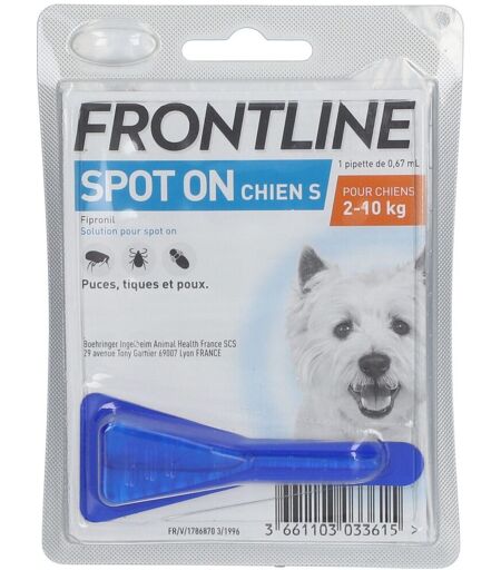 FRONTLINE Spot-On permet de lutter contre les parasites des chiens et des chats. Il est efficace contre : Les puces FRONTLINE Spot-On tue les puces adultes dans les 24 heures suivant leur arrivée sur votre animal. Les tiques FRONTLINE Spot-On élimine plus de 90 % des tiques dans les 48 heures suivant leur arrivée sur l'animal, afin de limiter le risque de transmission de maladies Ce risque est maximal 48 heures après fixation de la tique sur l’animal. Les poux des chiens et des chats FRONTLINE Spot-On tue les poux présents sur l’animal en 48 heures maximum. Indications Pour les chiens de 2 - 10 kg. Conseils d'utilisation Sortir la pipette de son emballage et casser l'embout au niveau de la partie prédécoupée. Ecartez les poils à la base du cou entre les omoplates jusqu’à ce que la peau de votre animal soit visible.L’application sur le chat doit se faire bien à la base de la tête afin d’éviter que l’animal puisse le lécher lui-même. L’application sur le chat doit se faire bien à la base de la tête afin d’éviter que l’animal puisse le lécher lui-même. Appliquer sur une peau sèche. Attendre 2 jours après l’application avant de baigner votre animal. Conditionnement 1 pipette Il est indispensable de demander l’avis de votre vétérinaire ou de votre pharmacien. Si les symptômes persistent, consultez votre vétérinaire. ...
