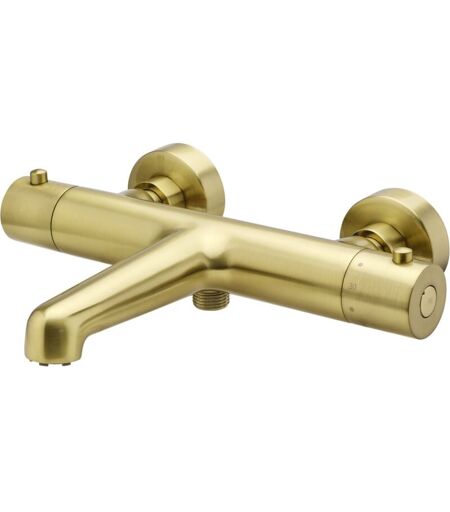 Le mitigeur minimaliste et contemporain, voici Luisa le robinet bain-douche en version or brossé. Il dispose d'une sécurité anti-brûlure pour une utilisation en toute tranquillité. DESIGN : - Mitigeur bain-douche thermostatique mural - Finition or brossé. - Corps rond. - Sortie prévue pour flexible QUALITE: - Corps en laiton finition or brossé. - Cartouche à disques céramique (cran 1/2 tour pour pression maximale) - Inverseur sur la poignée - Entraxe 150mm. - Poignées en métal or brossé (affichage de température et affichage du débit grace a des pictos). - Raccords laiton et rosaces. SÉCURITÉ : - Sécurité anti-brulure (bouton de blocage à 38° évitera tout risques de brûlures) COMPATIBILITE : - Fonctionne uniquement avec chauffe-eau électrique à accumulation de type cumulus (chauffe eau classique qui fonctionne une fois par nuit / généralement sur les heures creuses). Non compatible avec production d'eau chaude instantanée type chaudière à gaz, chauffage collectif, système ...