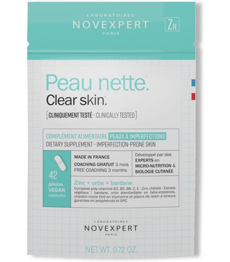 Formulé par les scientifiques Novexpert pour réduire les imperfections et matifier la peau, le complexe Peau nette traite à la fois les causes et les symptômes pour un effet immédiat et long terme. Le zinc diminue par exemple l'activité de l'enzyme qui transforme la testostérone en hormone pro-imperfections. Côté symptômes, les extraits d'Ortie et de Chardon Marie boostés limitent l'inflammation ainsi que l'oxydation pour réduire la sévérité des imperfections. Fait unique sur le marché de la nutraceutique, leur efficacité est 100% testée cliniquement et les chiffres parlent d'eux-mêmes : -67% de sébum en 28 jours ! Et ce n'est qu'un aperçu… ANTI-IMPERFECTIONS Jusqu'à -50% d'imperfections en 28 jours*. MATIFIANT - 67% de sébum en moins de 2 mois*. Etude clinique indépendante réalisée sous contrôle médical sur 56 jours- mesure du sébum par test instrumental Signes cliniques évalués par un scoring dermatologique : rougeurs, comédons fermés & ouverts ...