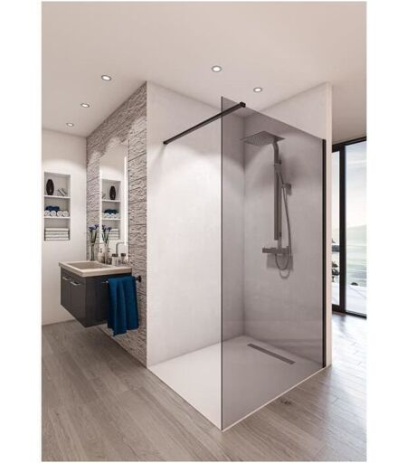 Paroi de 1400 mm de largeur, verre Parsol gris teinté dans la masse 8 mm, trempé selon EN12150. Quincaillerie noire mat. Fabrication française Saint-Gobain ...
