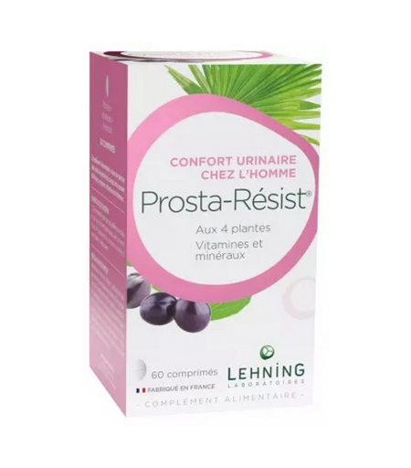Prosta-Résist accompagne les hommes face au vieillissement naturel de leur prostate. Inconfort urinaire, miction difficile, sensations de gêne : ces signes peuvent survenir dès la cinquantaine, avec dans certains cas une hypertrophie bénigne de la prostate (HBP). Les Laboratoires Lehning ont sélectionné pour vous 4 plantes couplées à des vitamines et minéraux qui agissent en synergie, pour favoriser votre confort urinaire et le bon fonctionnement de votre prostate. Le palmier nain contribue au fonctionnement normal de la prostate. Le prunier d'Afrique et l'huile de pépins de courge aident à maintenir une fonction urinaire normale chez l'homme. L'ortie favorise l'élimination de l'eau par les reins. La vitamine B2, la vitamine E, le sélénium et le zinc contribuent à protéger les cellules contre le stress oxydatif. ...