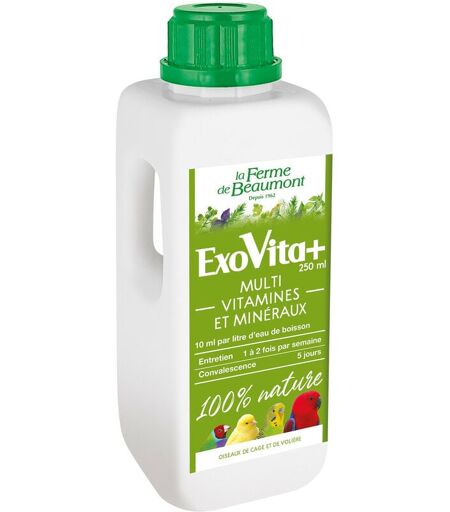 Exovita plus de la ferme de beaumont est un complément alimentaire pour oiseaux exotiques vitaminé très complet avec oligo-éléments, tonifie et fortifie l'organisme et maintient les oiseaux en bonne santé. Flacon de 250 ml. dosage de l'exovita plus par litre d’eau de boisson entretien :1 à 2 fois par semaine convalescence :5 jours conseils d'utilisation de l'exovita plus aliment complémentaire liquide. Formulation adaptée aux oiseaux exotiques. composition de l'exovita plus prèle, orge et houblon. teneur en constituants analytiques de l'exovita plus - cendres brutes : 0,5% - matières grasses : 1,6% - protéines : traces - cellulose : 0,1% - lysine : traces - méthionine : traces - sodium : 50 mg/l additifs au litre e671 vit d3 : 110 000 ui, 3a700vit e : 5 000 ui, e300 vit c : 1 000 mg, vit b1 : 100 mg, e101 vit b2 : 120 mg, vit b12 : 0,500 mg, e375 vit pp : 300 mg, choline : 100 mg, vit h : 50 mg, vit b5 : 200 mg, vit b6 : 500 mg réservé à l’alimentation animale. n° d’enregistrement : ...