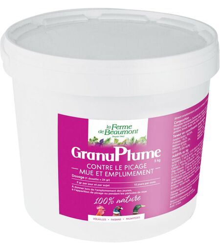 Le GranuPlume de la Ferme de Beaumont est un granulé développé pour tous les problèmes liés au plumage : qualité des phanères (plumes), picage, mue, étanchéité du plumage. Pour les canards, les poules, etc. Contient vitamines, minéraux oligo-éléments, particulièrement riche en méthionine et en lysine, indispensables pour les plumes. Granulés, avec dosette. Comment utiliser le GranuPlume ? Pour volailles, faisans, palmipèdes. À donner lors de l’emplumement des jeunes, à l’apparition de picage ou pendant les périodes de mue. Dosage du GranuPlume 1 dosette = 24 gr 2 gr par jour et par sujet :10 jours par mois Conseils d'utilisation du GranuPlume Aliment complémentaire granulé à mélanger à l’aliment. La consommation des œufs de vos animaux est possible pendant l’utilisation du produit. Composition du GranuPlume Phosphate bicalcique, Carbonate de calcium, Levure de bière, fenugrec, oxyde de magnésium, alfafa, mélasse, huile de lin, gentiane, fenouil, boldo, ortie, thym, anis, algues ...