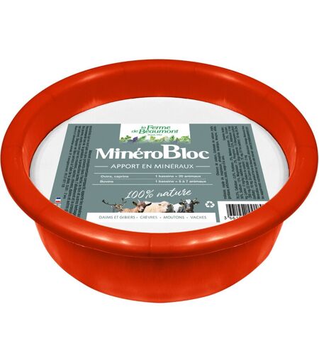 MinéroBloc de la Ferme de Beaumont est une bassine de minéraux à lécher convenant pour tous les mammifères : moutons, chèvres, bovins, lamas… MinéroBloc permet de palier aux carences minérales lorsque les animaux sont à l'herbage. Présenté en bassine à poser sur le sol. Bassine de 10 kg. COMMENT UTILISER LE MINÉROBLOC ? Pour moutons, chèvres, vaches, daims et gibiers. DOSAGE DU MINÉROBLOC Ovins, caprins 1 bassine = 20 animaux Bovins 1 bassine = 5 à 7 animaux CONSEILS D'UTILISATION DU MINÉROBLOC Conseils d'emploi Aliment complémentaire compacté, apporte les minéraux essentiels qui ne sont pas ou peu présents dans l’herbe, le foin et autres herbages. Recommandé lors de la gestation, la production lactée, l’allaitement et la croissance des jeunes, sevrés ou non pour les moutons, vaches, chèvres, daims et autres gibiers qui pâturent. Disposer en libre service à l’abri de la pluie. COMPOSITION DU MINÉROBLOC Chlorure de sodium, Carbonate de calcium, argile, mélasse, oxyde de magnésium, ...