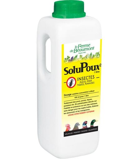SoluPoux² de la Ferme de Beaumont est un produit à usage externe contre les puces, poux, tiques, punaises pour volailles et oiseaux d'ornement à base d'ammoniums quaternaires, d'huiles essentielles et d'extraits naturels de plantes, permettant de lutter efficacement contre les infestations des parasites externes qui minent vos volailles d'ornement. En pulvérisation directe sur l'habitat sans danger pour les animaux. Enlevez les abreuvoirs et les mangeoires. 500 ml pour 5 litres d'eau. Avec bouchon doseur. Flacon de 1 litre. Fiches de données de sécurité disponibles sur simple demande. DOSAGE DU SOLUPOUX² solution concentrée à diluer 100 ml pour 1 litre CONSEILS D'UTILISATION DU SOLUPOUX² Traitement des poux, puces, tiques, punaises etc. En pulvérisation directe sur l’habitat en présence ou non des animaux, sans danger pour les sujets traités. Enlevez les abreuvoirs et les mangeoires. USAGE STRICTEMENT EXTERNE Diluer seulement le produit nécessaire, sinon sa conservation ne pourra ...