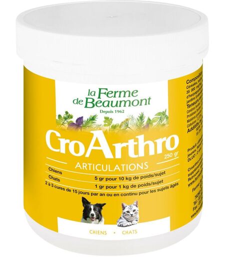 CroArthro Ferme de Beaumont soulage les chiens et chats souffrant des douleurs articulaires. Sous forme de granulés appétants à ajouter à la nourriture. à base de plantes : harpagophytum, soucis des jardins (calendula), pensée sauvage. Utilisable durant la gestation, l’allaitement et pour les très jeunes. Cures 2 à 3 fois par an pendant 15 jours ou en continu pour les sujets âgés. Dosage par poids : Chien 5 gr / 10 kg, chat 1 gr / 1 kg. Conseils d’utilisation du CroArthro Chien :5 gr par jour pour 10 kg de poids Chat :1 gr par jour pour 1 kg de poids doubler la dose la 1ère semaine 2 à 3 cures de 15 jours par an ou en continu pour les sujets âgés Composition du CroArthro Céréales, argile, mélasse, charbon végétal, sulfate de glucosamine: 35 000 mg/kg, Sulfate de chondroïtine : 23 000 mg/kg, macérés d’harpagophytum (harpagophytum procumbens), de soucis des jardins (calendula officinalis), de pensée sauvage (viola tricolor). Teneur en constituants analytiques du CroArthro - Cendres ...